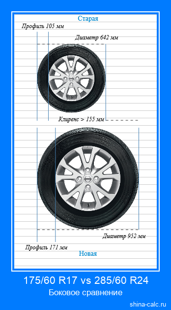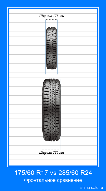 В таблице выше вы можете видеть детальное сравнение разницы размеров, параметров и характеристик между шиной с типоразмером 175/60 R17 и шиной с типоразмером 285/60 R24. Результаты вычислений также представлены в виде визуальных моделей (инфографики), на которых шина с размером 175/60 R17 находится сверху, а с размером 285/60 R24, соответственно, внизу. Визуализация сгенерирована в двух проекциях: боковая (слева) и фронтальная (справа). Онлайн калькулятор сравнивает шины по следующим характеристикам: диаметр, ширина, длина окружности, высота профиля, оборотов на км, изменение клиренса. Дополнительно вычисляется потенциальное отклонение между реальной и отображаемой на спидометре скоростью, которое может возникать, если различие между шинами 175/60 R17 и 285/60 R24 является значительным.
