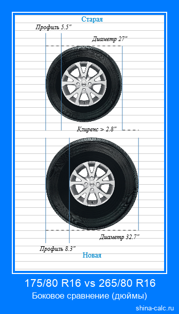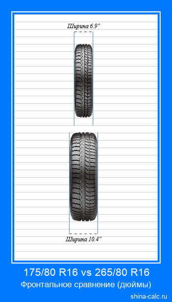 В таблице выше вы можете видеть детальное сравнение разницы размеров, параметров и характеристик между шиной с типоразмером 175/80 R16 и шиной с типоразмером 265/80 R16. Результаты вычислений также представлены в виде визуальных моделей (инфографики), на которых шина с размером 175/80 R16 находится сверху, а с размером 265/80 R16, соответственно, внизу. Визуализация сгенерирована в двух проекциях: боковая (слева) и фронтальная (справа). Онлайн калькулятор сравнивает шины по следующим характеристикам: диаметр, ширина, длина окружности, высота профиля, оборотов на км, изменение клиренса. Дополнительно вычисляется потенциальное отклонение между реальной и отображаемой на спидометре скоростью, которое может возникать, если различие между шинами 175/80 R16 и 265/80 R16 является значительным. Версия вычислений в дюймах для США и Великобритании.