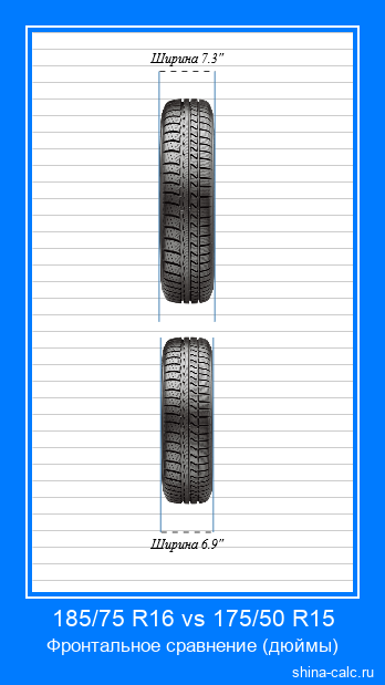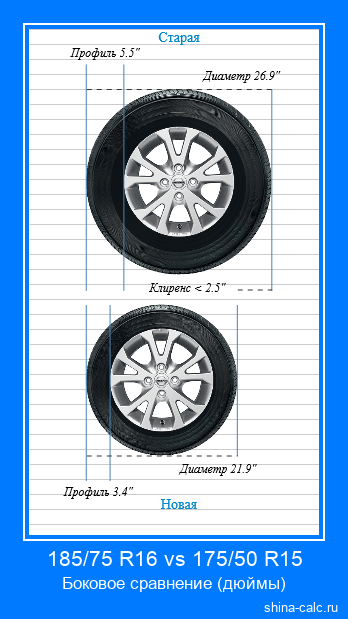 В таблице выше вы можете видеть детальное сравнение разницы размеров, параметров и характеристик между шиной с типоразмером 185/75 R16 и шиной с типоразмером 175/50 R15. Результаты вычислений также представлены в виде визуальных моделей (инфографики), на которых шина с размером 185/75 R16 находится сверху, а с размером 175/50 R15, соответственно, внизу. Визуализация сгенерирована в двух проекциях: боковая (слева) и фронтальная (справа). Онлайн калькулятор сравнивает шины по следующим характеристикам: диаметр, ширина, длина окружности, высота профиля, оборотов на км, изменение клиренса. Дополнительно вычисляется потенциальное отклонение между реальной и отображаемой на спидометре скоростью, которое может возникать, если различие между шинами 185/75 R16 и 175/50 R15 является значительным. Версия вычислений в дюймах для США и Великобритании.