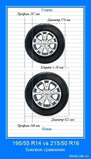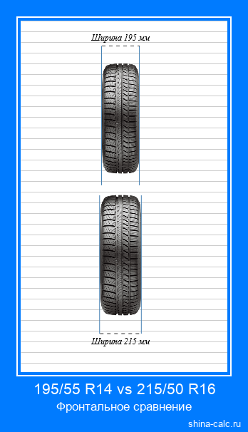 В таблице выше вы можете видеть детальное сравнение разницы размеров, параметров и характеристик между шиной с типоразмером 195/55 R14 и шиной с типоразмером 215/50 R16. Результаты вычислений также представлены в виде визуальных моделей (инфографики), на которых шина с размером 195/55 R14 находится сверху, а с размером 215/50 R16, соответственно, внизу. Визуализация сгенерирована в двух проекциях: боковая (слева) и фронтальная (справа). Онлайн калькулятор сравнивает шины по следующим характеристикам: диаметр, ширина, длина окружности, высота профиля, оборотов на км, изменение клиренса. Дополнительно вычисляется потенциальное отклонение между реальной и отображаемой на спидометре скоростью, которое может возникать, если различие между шинами 195/55 R14 и 215/50 R16 является значительным.