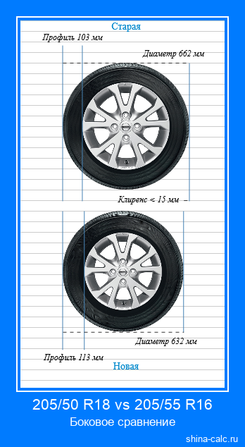 В таблице выше вы можете видеть детальное сравнение разницы размеров, параметров и характеристик между шиной с типоразмером 205/50 R18 и шиной с типоразмером 205/55 R16. Результаты вычислений также представлены в виде визуальных моделей (инфографики), на которых шина с размером 205/50 R18 находится сверху, а с размером 205/55 R16, соответственно, внизу. Визуализация сгенерирована в двух проекциях: боковая (слева) и фронтальная (справа). Онлайн калькулятор сравнивает шины по следующим характеристикам: диаметр, ширина, длина окружности, высота профиля, оборотов на км, изменение клиренса. Дополнительно вычисляется потенциальное отклонение между реальной и отображаемой на спидометре скоростью, которое может возникать, если различие между шинами 205/50 R18 и 205/55 R16 является значительным.