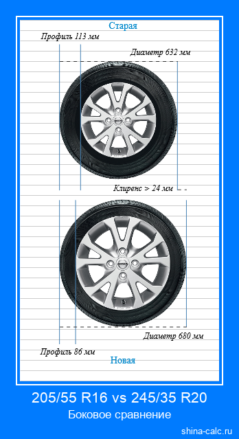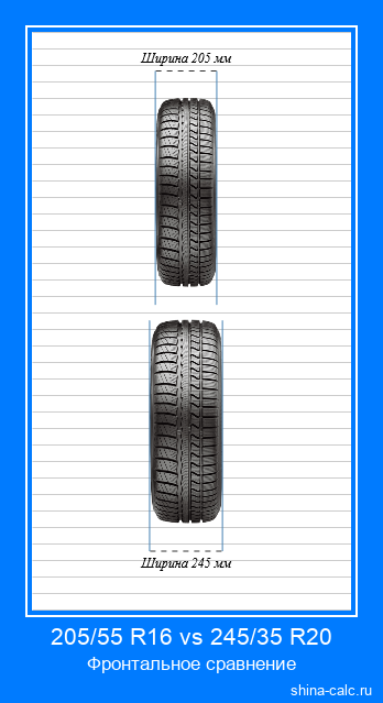 В таблице выше вы можете видеть детальное сравнение разницы размеров, параметров и характеристик между шиной с типоразмером 205/55 R16 и шиной с типоразмером 245/35 R20. Результаты вычислений также представлены в виде визуальных моделей (инфографики), на которых шина с размером 205/55 R16 находится сверху, а с размером 245/35 R20, соответственно, внизу. Визуализация сгенерирована в двух проекциях: боковая (слева) и фронтальная (справа). Онлайн калькулятор сравнивает шины по следующим характеристикам: диаметр, ширина, длина окружности, высота профиля, оборотов на км, изменение клиренса. Дополнительно вычисляется потенциальное отклонение между реальной и отображаемой на спидометре скоростью, которое может возникать, если различие между шинами 205/55 R16 и 245/35 R20 является значительным.