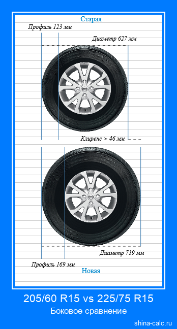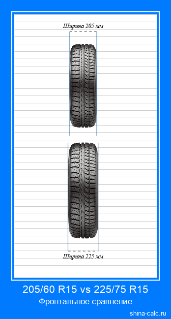 В таблице выше вы можете видеть детальное сравнение разницы размеров, параметров и характеристик между шиной с типоразмером 205/60 R15 и шиной с типоразмером 225/75 R15. Результаты вычислений также представлены в виде визуальных моделей (инфографики), на которых шина с размером 205/60 R15 находится сверху, а с размером 225/75 R15, соответственно, внизу. Визуализация сгенерирована в двух проекциях: боковая (слева) и фронтальная (справа). Онлайн калькулятор сравнивает шины по следующим характеристикам: диаметр, ширина, длина окружности, высота профиля, оборотов на км, изменение клиренса. Дополнительно вычисляется потенциальное отклонение между реальной и отображаемой на спидометре скоростью, которое может возникать, если различие между шинами 205/60 R15 и 225/75 R15 является значительным.