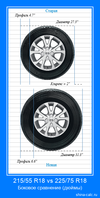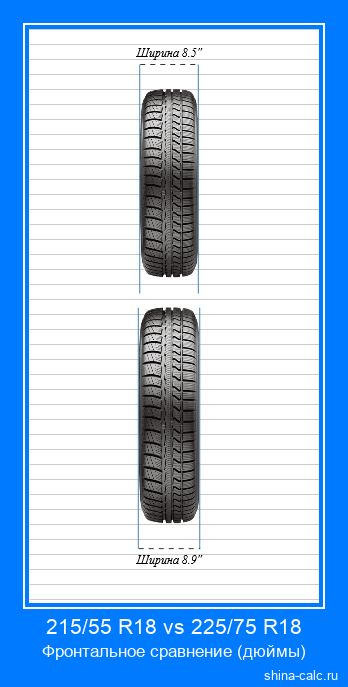 В таблице выше вы можете видеть детальное сравнение разницы размеров, параметров и характеристик между шиной с типоразмером 215/55 R18 и шиной с типоразмером 225/75 R18. Результаты вычислений также представлены в виде визуальных моделей (инфографики), на которых шина с размером 215/55 R18 находится сверху, а с размером 225/75 R18, соответственно, внизу. Визуализация сгенерирована в двух проекциях: боковая (слева) и фронтальная (справа). Онлайн калькулятор сравнивает шины по следующим характеристикам: диаметр, ширина, длина окружности, высота профиля, оборотов на км, изменение клиренса. Дополнительно вычисляется потенциальное отклонение между реальной и отображаемой на спидометре скоростью, которое может возникать, если различие между шинами 215/55 R18 и 225/75 R18 является значительным. Версия вычислений в дюймах для США и Великобритании.