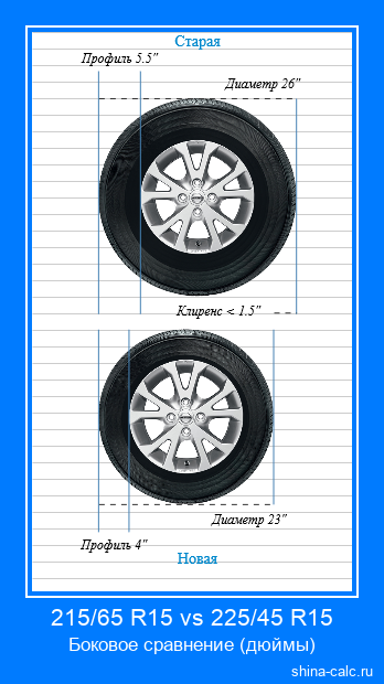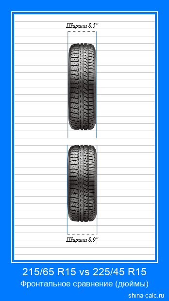В таблице выше вы можете видеть детальное сравнение разницы размеров, параметров и характеристик между шиной с типоразмером 215/65 R15 и шиной с типоразмером 225/45 R15. Результаты вычислений также представлены в виде визуальных моделей (инфографики), на которых шина с размером 215/65 R15 находится сверху, а с размером 225/45 R15, соответственно, внизу. Визуализация сгенерирована в двух проекциях: боковая (слева) и фронтальная (справа). Онлайн калькулятор сравнивает шины по следующим характеристикам: диаметр, ширина, длина окружности, высота профиля, оборотов на км, изменение клиренса. Дополнительно вычисляется потенциальное отклонение между реальной и отображаемой на спидометре скоростью, которое может возникать, если различие между шинами 215/65 R15 и 225/45 R15 является значительным. Версия вычислений в дюймах для США и Великобритании.