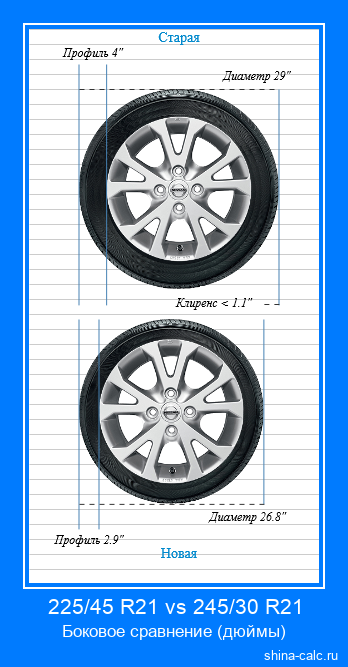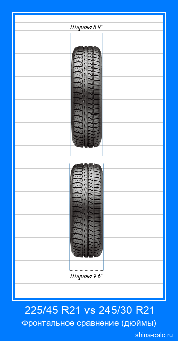 В таблице выше вы можете видеть детальное сравнение разницы размеров, параметров и характеристик между шиной с типоразмером 225/45 R21 и шиной с типоразмером 245/30 R21. Результаты вычислений также представлены в виде визуальных моделей (инфографики), на которых шина с размером 225/45 R21 находится сверху, а с размером 245/30 R21, соответственно, внизу. Визуализация сгенерирована в двух проекциях: боковая (слева) и фронтальная (справа). Онлайн калькулятор сравнивает шины по следующим характеристикам: диаметр, ширина, длина окружности, высота профиля, оборотов на км, изменение клиренса. Дополнительно вычисляется потенциальное отклонение между реальной и отображаемой на спидометре скоростью, которое может возникать, если различие между шинами 225/45 R21 и 245/30 R21 является значительным. Версия вычислений в дюймах для США и Великобритании.