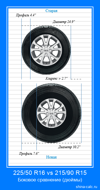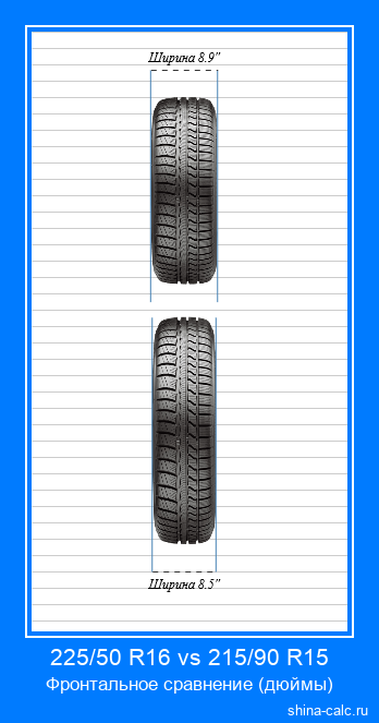 В таблице выше вы можете видеть детальное сравнение разницы размеров, параметров и характеристик между шиной с типоразмером 225/50 R16 и шиной с типоразмером 215/90 R15. Результаты вычислений также представлены в виде визуальных моделей (инфографики), на которых шина с размером 225/50 R16 находится сверху, а с размером 215/90 R15, соответственно, внизу. Визуализация сгенерирована в двух проекциях: боковая (слева) и фронтальная (справа). Онлайн калькулятор сравнивает шины по следующим характеристикам: диаметр, ширина, длина окружности, высота профиля, оборотов на км, изменение клиренса. Дополнительно вычисляется потенциальное отклонение между реальной и отображаемой на спидометре скоростью, которое может возникать, если различие между шинами 225/50 R16 и 215/90 R15 является значительным. Версия вычислений в дюймах для США и Великобритании.