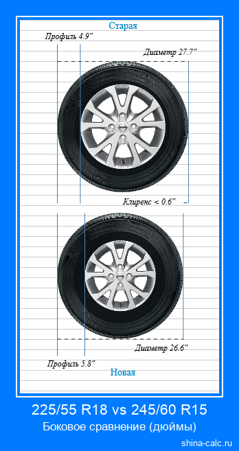 В таблице выше вы можете видеть детальное сравнение разницы размеров, параметров и характеристик между шиной с типоразмером 225/55 R18 и шиной с типоразмером 245/60 R15. Результаты вычислений также представлены в виде визуальных моделей (инфографики), на которых шина с размером 225/55 R18 находится сверху, а с размером 245/60 R15, соответственно, внизу. Визуализация сгенерирована в двух проекциях: боковая (слева) и фронтальная (справа). Онлайн калькулятор сравнивает шины по следующим характеристикам: диаметр, ширина, длина окружности, высота профиля, оборотов на км, изменение клиренса. Дополнительно вычисляется потенциальное отклонение между реальной и отображаемой на спидометре скоростью, которое может возникать, если различие между шинами 225/55 R18 и 245/60 R15 является значительным. Версия вычислений в дюймах для США и Великобритании.