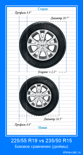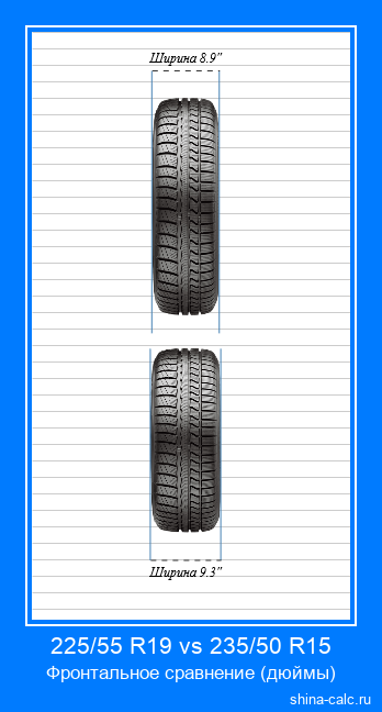 В таблице выше вы можете видеть детальное сравнение разницы размеров, параметров и характеристик между шиной с типоразмером 225/55 R19 и шиной с типоразмером 235/50 R15. Результаты вычислений также представлены в виде визуальных моделей (инфографики), на которых шина с размером 225/55 R19 находится сверху, а с размером 235/50 R15, соответственно, внизу. Визуализация сгенерирована в двух проекциях: боковая (слева) и фронтальная (справа). Онлайн калькулятор сравнивает шины по следующим характеристикам: диаметр, ширина, длина окружности, высота профиля, оборотов на км, изменение клиренса. Дополнительно вычисляется потенциальное отклонение между реальной и отображаемой на спидометре скоростью, которое может возникать, если различие между шинами 225/55 R19 и 235/50 R15 является значительным. Версия вычислений в дюймах для США и Великобритании.