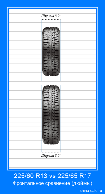 В таблице выше вы можете видеть детальное сравнение разницы размеров, параметров и характеристик между шиной с типоразмером 225/60 R13 и шиной с типоразмером 225/65 R17. Результаты вычислений также представлены в виде визуальных моделей (инфографики), на которых шина с размером 225/60 R13 находится сверху, а с размером 225/65 R17, соответственно, внизу. Визуализация сгенерирована в двух проекциях: боковая (слева) и фронтальная (справа). Онлайн калькулятор сравнивает шины по следующим характеристикам: диаметр, ширина, длина окружности, высота профиля, оборотов на км, изменение клиренса. Дополнительно вычисляется потенциальное отклонение между реальной и отображаемой на спидометре скоростью, которое может возникать, если различие между шинами 225/60 R13 и 225/65 R17 является значительным. Версия вычислений в дюймах для США и Великобритании.