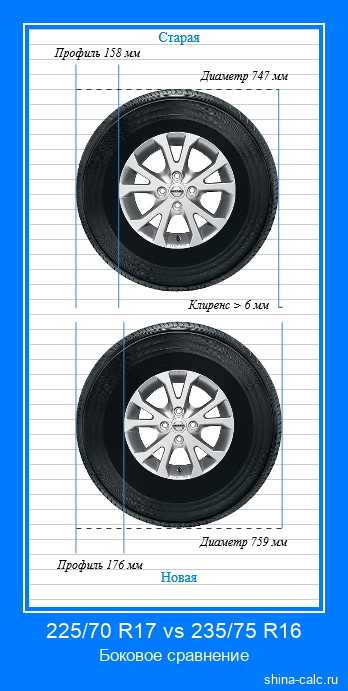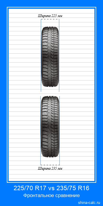 В таблице выше вы можете видеть детальное сравнение разницы размеров, параметров и характеристик между шиной с типоразмером 225/70 R17 и шиной с типоразмером 235/75 R16. Результаты вычислений также представлены в виде визуальных моделей (инфографики), на которых шина с размером 225/70 R17 находится сверху, а с размером 235/75 R16, соответственно, внизу. Визуализация сгенерирована в двух проекциях: боковая (слева) и фронтальная (справа). Онлайн калькулятор сравнивает шины по следующим характеристикам: диаметр, ширина, длина окружности, высота профиля, оборотов на км, изменение клиренса. Дополнительно вычисляется потенциальное отклонение между реальной и отображаемой на спидометре скоростью, которое может возникать, если различие между шинами 225/70 R17 и 235/75 R16 является значительным.