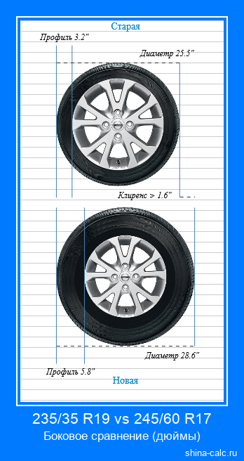 В таблице выше вы можете видеть детальное сравнение разницы размеров, параметров и характеристик между шиной с типоразмером 235/35 R19 и шиной с типоразмером 245/60 R17. Результаты вычислений также представлены в виде визуальных моделей (инфографики), на которых шина с размером 235/35 R19 находится сверху, а с размером 245/60 R17, соответственно, внизу. Визуализация сгенерирована в двух проекциях: боковая (слева) и фронтальная (справа). Онлайн калькулятор сравнивает шины по следующим характеристикам: диаметр, ширина, длина окружности, высота профиля, оборотов на км, изменение клиренса. Дополнительно вычисляется потенциальное отклонение между реальной и отображаемой на спидометре скоростью, которое может возникать, если различие между шинами 235/35 R19 и 245/60 R17 является значительным. Версия вычислений в дюймах для США и Великобритании.