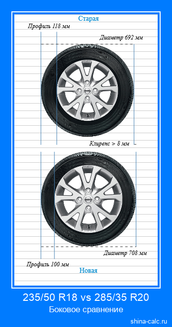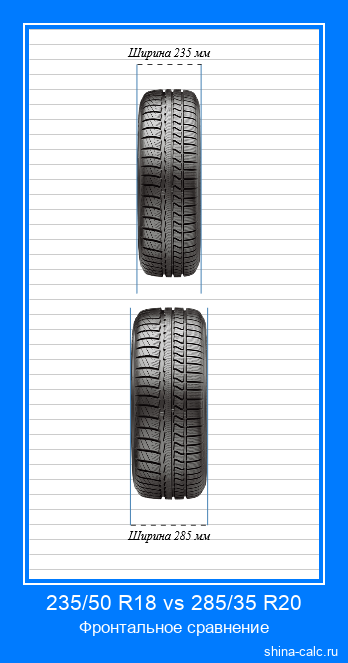 В таблице выше вы можете видеть детальное сравнение разницы размеров, параметров и характеристик между шиной с типоразмером 235/50 R18 и шиной с типоразмером 285/35 R20. Результаты вычислений также представлены в виде визуальных моделей (инфографики), на которых шина с размером 235/50 R18 находится сверху, а с размером 285/35 R20, соответственно, внизу. Визуализация сгенерирована в двух проекциях: боковая (слева) и фронтальная (справа). Онлайн калькулятор сравнивает шины по следующим характеристикам: диаметр, ширина, длина окружности, высота профиля, оборотов на км, изменение клиренса. Дополнительно вычисляется потенциальное отклонение между реальной и отображаемой на спидометре скоростью, которое может возникать, если различие между шинами 235/50 R18 и 285/35 R20 является значительным.