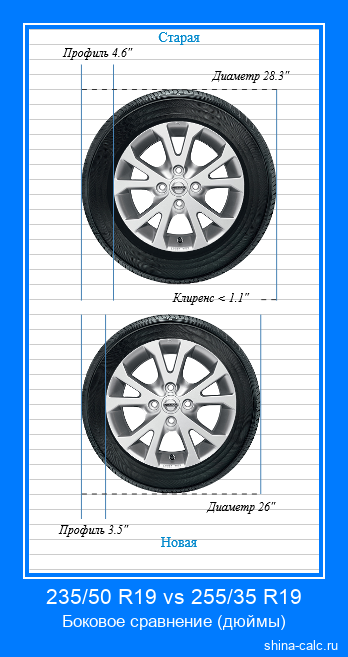 В таблице выше вы можете видеть детальное сравнение разницы размеров, параметров и характеристик между шиной с типоразмером 235/50 R19 и шиной с типоразмером 255/35 R19. Результаты вычислений также представлены в виде визуальных моделей (инфографики), на которых шина с размером 235/50 R19 находится сверху, а с размером 255/35 R19, соответственно, внизу. Визуализация сгенерирована в двух проекциях: боковая (слева) и фронтальная (справа). Онлайн калькулятор сравнивает шины по следующим характеристикам: диаметр, ширина, длина окружности, высота профиля, оборотов на км, изменение клиренса. Дополнительно вычисляется потенциальное отклонение между реальной и отображаемой на спидометре скоростью, которое может возникать, если различие между шинами 235/50 R19 и 255/35 R19 является значительным. Версия вычислений в дюймах для США и Великобритании.