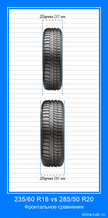 В таблице выше вы можете видеть детальное сравнение разницы размеров, параметров и характеристик между шиной с типоразмером 235/60 R18 и шиной с типоразмером 285/50 R20. Результаты вычислений также представлены в виде визуальных моделей (инфографики), на которых шина с размером 235/60 R18 находится сверху, а с размером 285/50 R20, соответственно, внизу. Визуализация сгенерирована в двух проекциях: боковая (слева) и фронтальная (справа). Онлайн калькулятор сравнивает шины по следующим характеристикам: диаметр, ширина, длина окружности, высота профиля, оборотов на км, изменение клиренса. Дополнительно вычисляется потенциальное отклонение между реальной и отображаемой на спидометре скоростью, которое может возникать, если различие между шинами 235/60 R18 и 285/50 R20 является значительным.