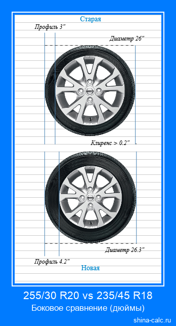 В таблице выше вы можете видеть детальное сравнение разницы размеров, параметров и характеристик между шиной с типоразмером 255/30 R20 и шиной с типоразмером 235/45 R18. Результаты вычислений также представлены в виде визуальных моделей (инфографики), на которых шина с размером 255/30 R20 находится сверху, а с размером 235/45 R18, соответственно, внизу. Визуализация сгенерирована в двух проекциях: боковая (слева) и фронтальная (справа). Онлайн калькулятор сравнивает шины по следующим характеристикам: диаметр, ширина, длина окружности, высота профиля, оборотов на км, изменение клиренса. Дополнительно вычисляется потенциальное отклонение между реальной и отображаемой на спидометре скоростью, которое может возникать, если различие между шинами 255/30 R20 и 235/45 R18 является значительным. Версия вычислений в дюймах для США и Великобритании.