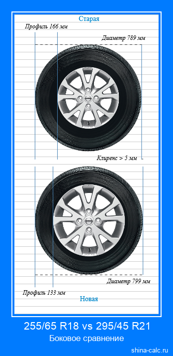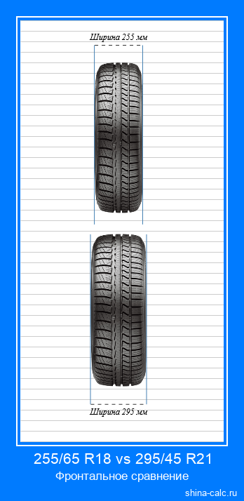 В таблице выше вы можете видеть детальное сравнение разницы размеров, параметров и характеристик между шиной с типоразмером 255/65 R18 и шиной с типоразмером 295/45 R21. Результаты вычислений также представлены в виде визуальных моделей (инфографики), на которых шина с размером 255/65 R18 находится сверху, а с размером 295/45 R21, соответственно, внизу. Визуализация сгенерирована в двух проекциях: боковая (слева) и фронтальная (справа). Онлайн калькулятор сравнивает шины по следующим характеристикам: диаметр, ширина, длина окружности, высота профиля, оборотов на км, изменение клиренса. Дополнительно вычисляется потенциальное отклонение между реальной и отображаемой на спидометре скоростью, которое может возникать, если различие между шинами 255/65 R18 и 295/45 R21 является значительным.