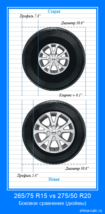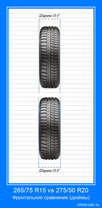 В таблице выше вы можете видеть детальное сравнение разницы размеров, параметров и характеристик между шиной с типоразмером 265/75 R15 и шиной с типоразмером 275/50 R20. Результаты вычислений также представлены в виде визуальных моделей (инфографики), на которых шина с размером 265/75 R15 находится сверху, а с размером 275/50 R20, соответственно, внизу. Визуализация сгенерирована в двух проекциях: боковая (слева) и фронтальная (справа). Онлайн калькулятор сравнивает шины по следующим характеристикам: диаметр, ширина, длина окружности, высота профиля, оборотов на км, изменение клиренса. Дополнительно вычисляется потенциальное отклонение между реальной и отображаемой на спидометре скоростью, которое может возникать, если различие между шинами 265/75 R15 и 275/50 R20 является значительным. Версия вычислений в дюймах для США и Великобритании.