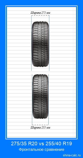 В таблице выше вы можете видеть детальное сравнение разницы размеров, параметров и характеристик между шиной с типоразмером 275/35 R20 и шиной с типоразмером 255/40 R19. Результаты вычислений также представлены в виде визуальных моделей (инфографики), на которых шина с размером 275/35 R20 находится сверху, а с размером 255/40 R19, соответственно, внизу. Визуализация сгенерирована в двух проекциях: боковая (слева) и фронтальная (справа). Онлайн калькулятор сравнивает шины по следующим характеристикам: диаметр, ширина, длина окружности, высота профиля, оборотов на км, изменение клиренса. Дополнительно вычисляется потенциальное отклонение между реальной и отображаемой на спидометре скоростью, которое может возникать, если различие между шинами 275/35 R20 и 255/40 R19 является значительным.