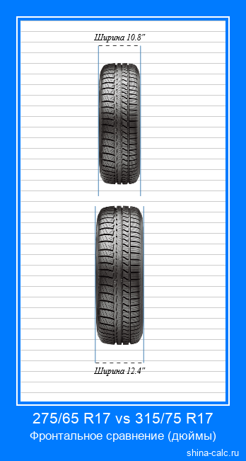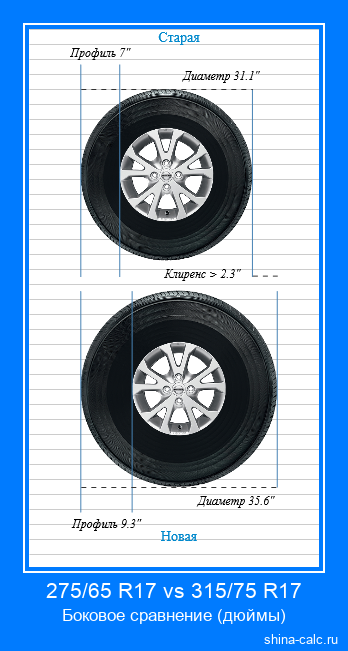 В таблице выше вы можете видеть детальное сравнение разницы размеров, параметров и характеристик между шиной с типоразмером 275/65 R17 и шиной с типоразмером 315/75 R17. Результаты вычислений также представлены в виде визуальных моделей (инфографики), на которых шина с размером 275/65 R17 находится сверху, а с размером 315/75 R17, соответственно, внизу. Визуализация сгенерирована в двух проекциях: боковая (слева) и фронтальная (справа). Онлайн калькулятор сравнивает шины по следующим характеристикам: диаметр, ширина, длина окружности, высота профиля, оборотов на км, изменение клиренса. Дополнительно вычисляется потенциальное отклонение между реальной и отображаемой на спидометре скоростью, которое может возникать, если различие между шинами 275/65 R17 и 315/75 R17 является значительным. Версия вычислений в дюймах для США и Великобритании.