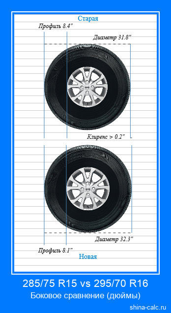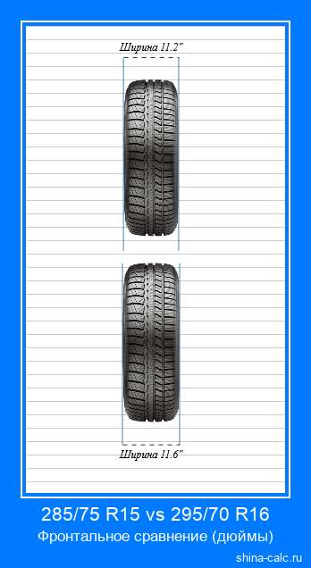 В таблице выше вы можете видеть детальное сравнение разницы размеров, параметров и характеристик между шиной с типоразмером 285/75 R15 и шиной с типоразмером 295/70 R16. Результаты вычислений также представлены в виде визуальных моделей (инфографики), на которых шина с размером 285/75 R15 находится сверху, а с размером 295/70 R16, соответственно, внизу. Визуализация сгенерирована в двух проекциях: боковая (слева) и фронтальная (справа). Онлайн калькулятор сравнивает шины по следующим характеристикам: диаметр, ширина, длина окружности, высота профиля, оборотов на км, изменение клиренса. Дополнительно вычисляется потенциальное отклонение между реальной и отображаемой на спидометре скоростью, которое может возникать, если различие между шинами 285/75 R15 и 295/70 R16 является значительным. Версия вычислений в дюймах для США и Великобритании.